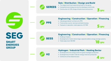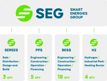 The Smart Energies Group (SEG) comprises four specialised companies (SEREES, PPS, BESS, H2) that together cover the entire life cycle of energy projects. We manage 30 SPVs under one roof, from distribution and backup power sources to battery and hydrogen solutions.